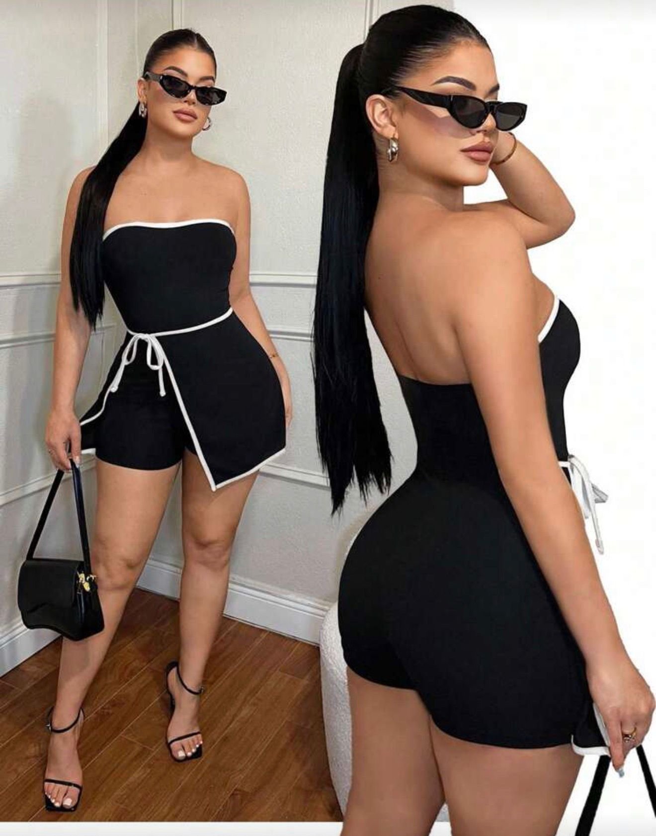 Este hermoso enterizo elegante bicolor con lazo en la cintura es una prenda moderna y versátil, ideal para mujeres que buscan un look sofisticado sin perder comodidad.